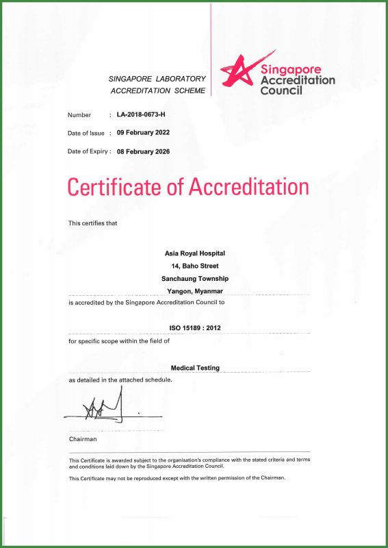 Over 20 years of experience in health care industry, we have achieved ISO 9001 certificate since September 2011 and registered in Global Compact (UN) since November 2013. Our ISO 9001 approval assures you the proven and standardized quality in each of our service. HSE committee was established in March 2015 to improve service and safety of our stakeholders. We have also been awarded ISO 15189 accreditation to our medical Laboratory in Feb 2018 by Singapore Accreditation Council (SAC). With reliable quality, we are always trying to achieve our customers’ trust and satisfaction.